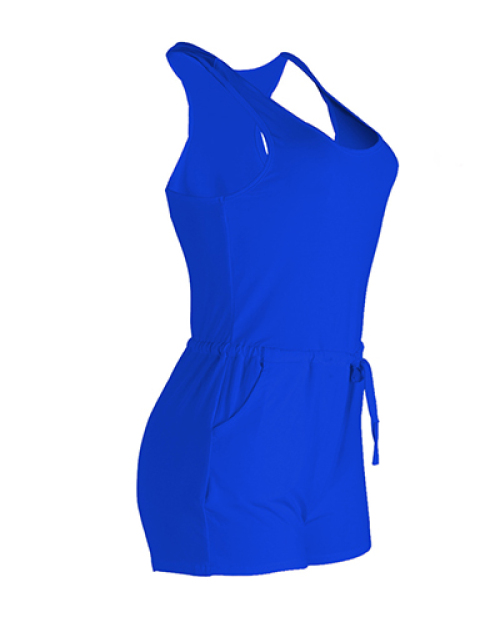 Leisure Sleeveless Drawstring Design Blue Polyester One-piece Skinny Jumpsuits