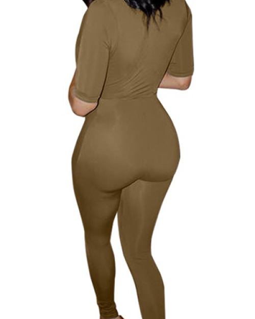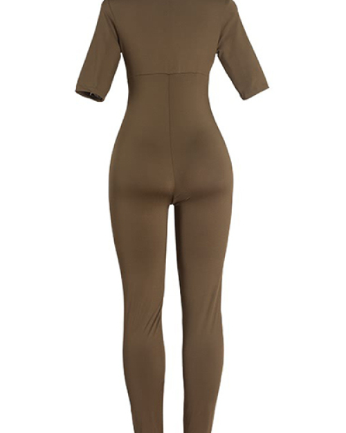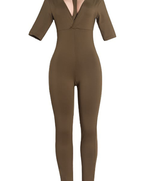 Sexy Halter Neck Short Sleeves Hollow-out Army Green Blending One-piece Skinny Jumpsuits