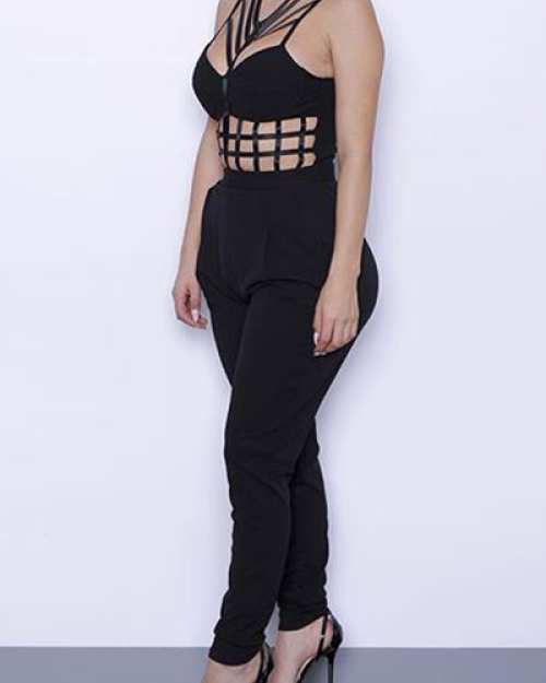 Sexy Halter Neck Sleeveless Hollow-out Black Polyester One-piece Jumpsuits