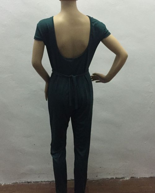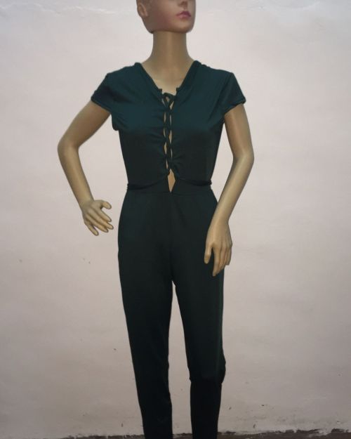 Sexy O Neck Short Sleeves Front Lace-up Hollow-out Backless Solid Green Cotton Blend One-piece Skinny Jumpsuit