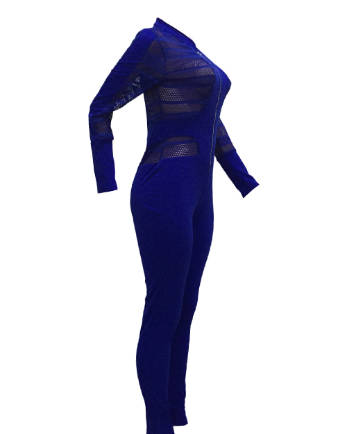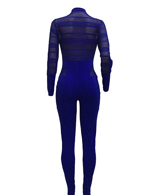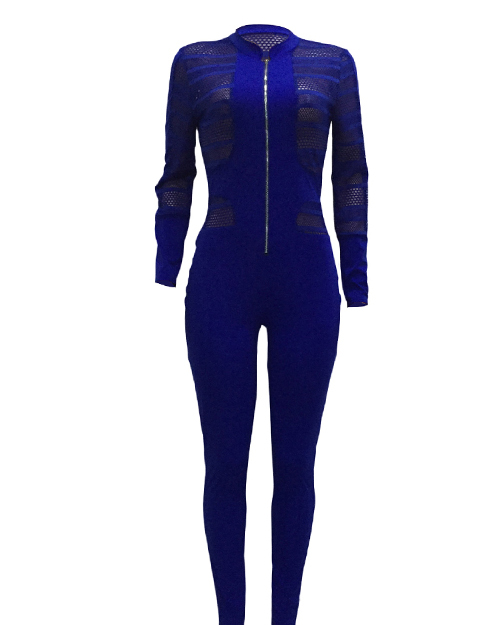Sexy Round Neck Long Sleeves Gauze Patchwork Deep Blue Polyester One-piece Skinny Jumpsuits