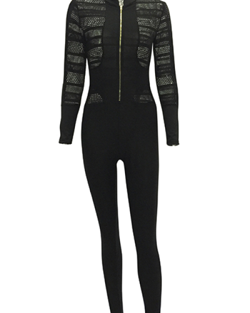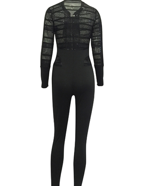 Sexy Round Neck Long Sleeves Gauze Patchwork Polyester One-piece Skinny Jumpsuits