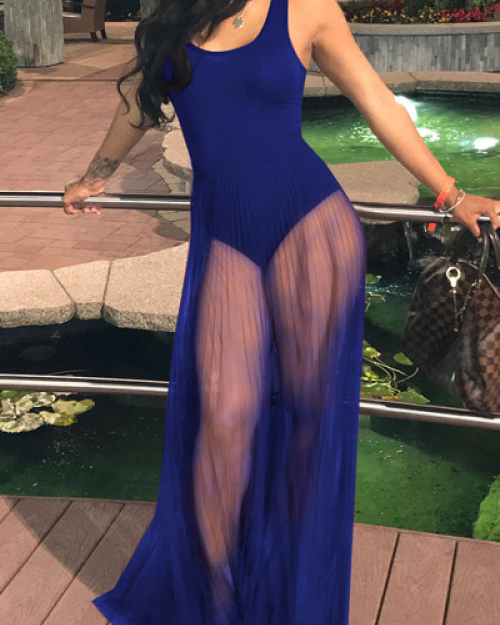 Sexy Round Neck See-Through Royalblue Cotton One-piece Jumpsuits