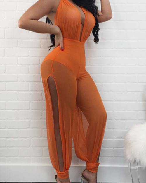 Sexy Sleeveless See-Through Orange Gauze One-piece Skinny Jumpsuits