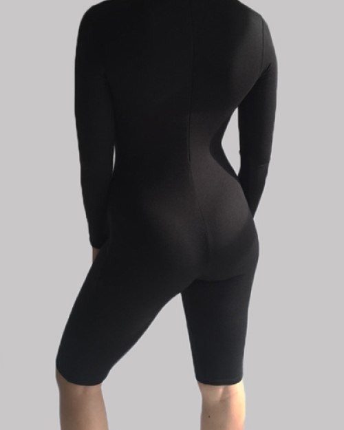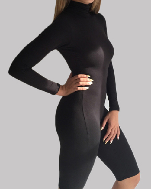 Sexy Turtleneck Long Sleeves Solid Black Spandex One-piece Skinny Jumpsuit
