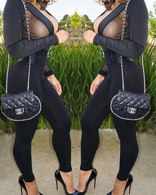 Sexy V Neck Long Sleeves Gauze Patchwork Black Polyester One-piece Skinny Jumpsuits