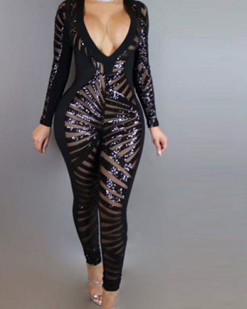 Sexy V Neck Long Sleeves See-Through Black Qmilch One-piece Skinny Jumpsuits