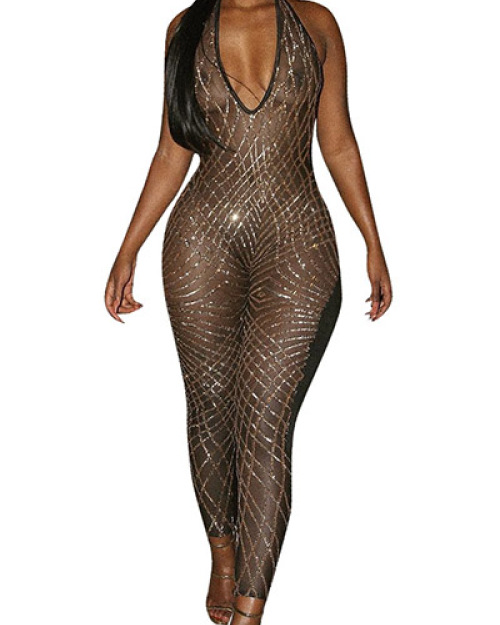 Sexy V Neck See-Through Gold Gauze One-piece Skinny Jumpsuits