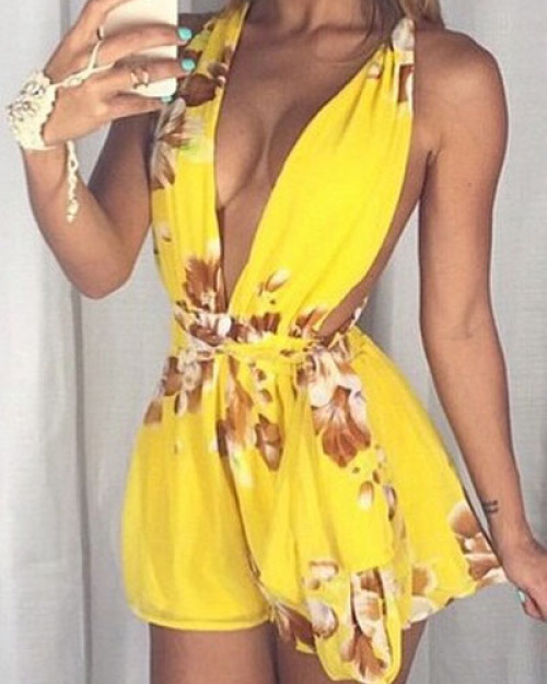 Sexy V Neck Sleeveless Floral Print Yellow Chiffon One-piece Regular Jumpsuit