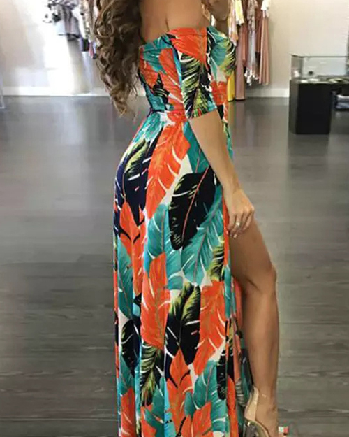 Stylish Bateau Neck Side Slit Feather Printed Green Polyester One-piece Jumpsuits