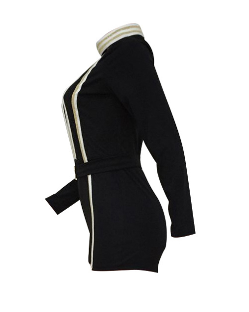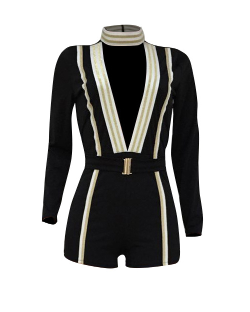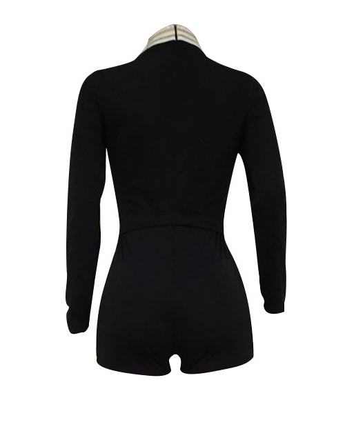 Stylish Deep V Neck Patchwork Black Cotton Blends One-piece Short Jumpsuits