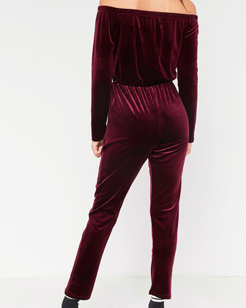 Stylish Dew Shoulder High Waist Red Velvet One-piece Jumpsuits