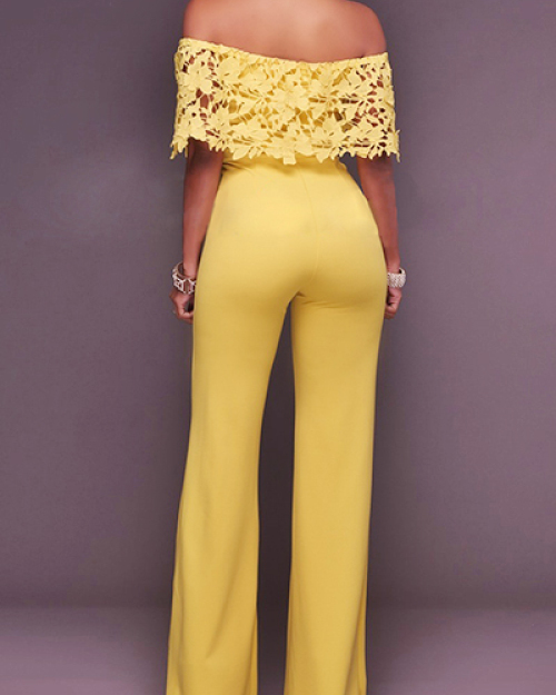 Stylish Dew Shoulder Hollow-out Yellow Twilled One-piece Jumpsuits