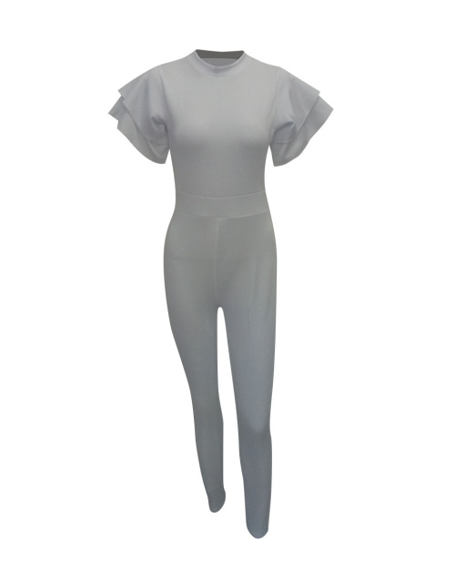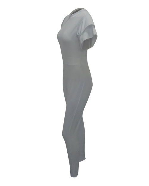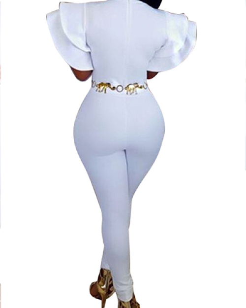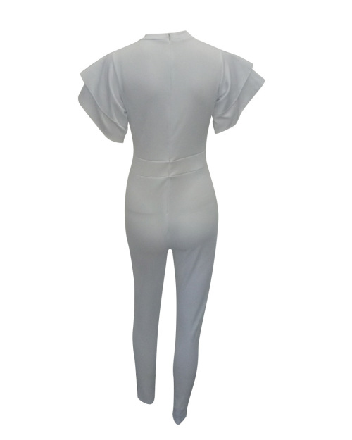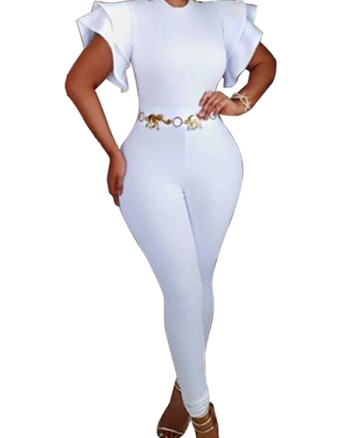 Stylish Round Neck Short Sleeves Falbala Design White Polyester One-piece Skinny Jumpsuits(Without Belt)