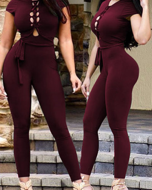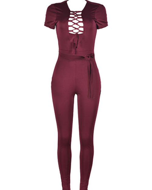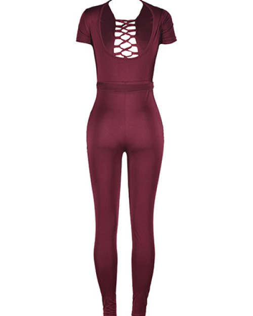 Stylish Round Neck Short Sleeves Hollow-out Wine Red Twilled One-piece Skinny Jumpsuits