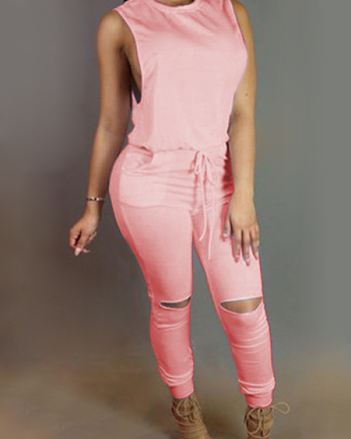 Trendy Round Neck Tank Sleeveless Zipper Design Drawstring Pink Polyester One-piece Jumpsuits