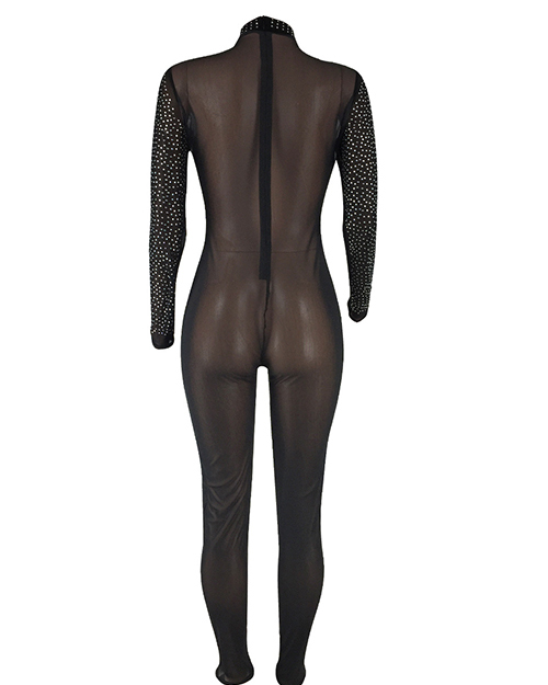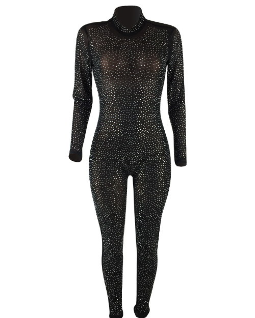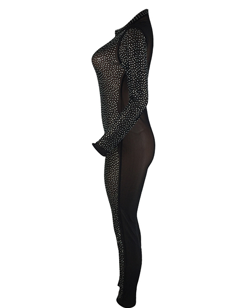 Trendy Turtleneck See-Through Hot Drilling Decorative Black Polyester One-piece Jumpsuits