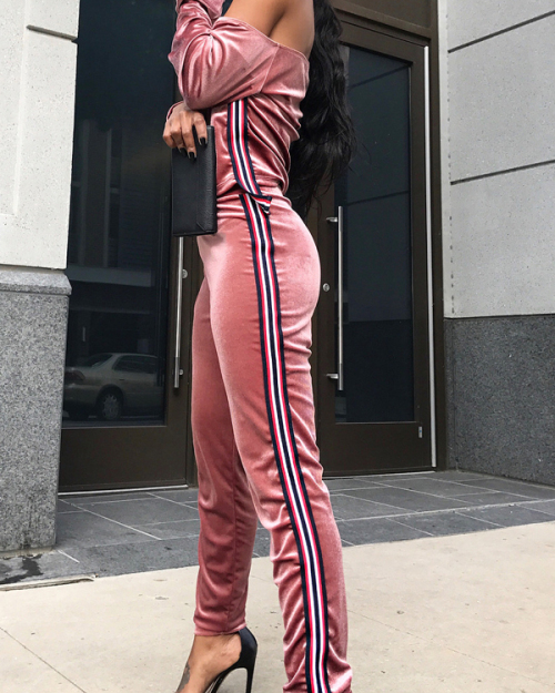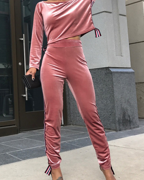 Leisure Dew Shoulder Patchwork Pink Velvet Two-piece Pants Set