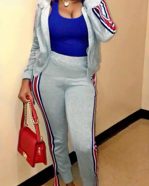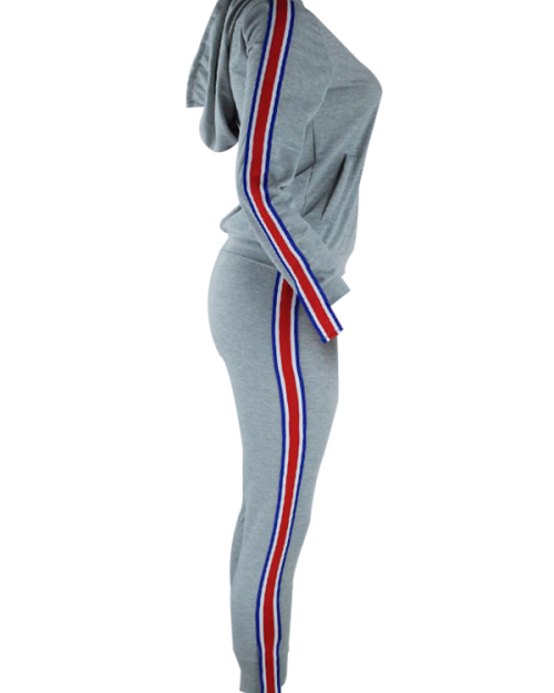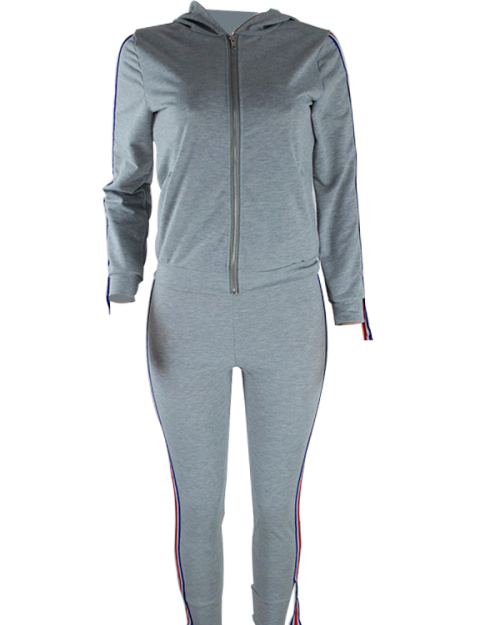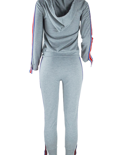 Leisure Hooded Collar Patchwork Grey Cotton Two-Piece Pants Set