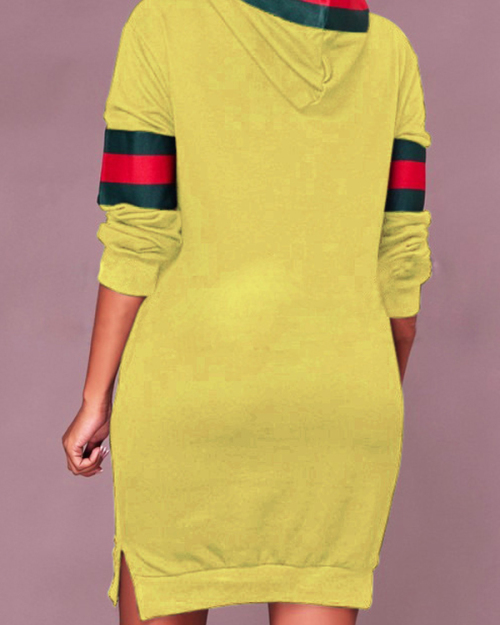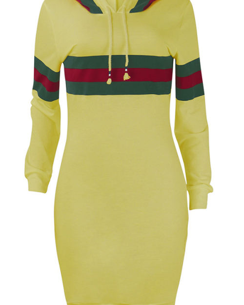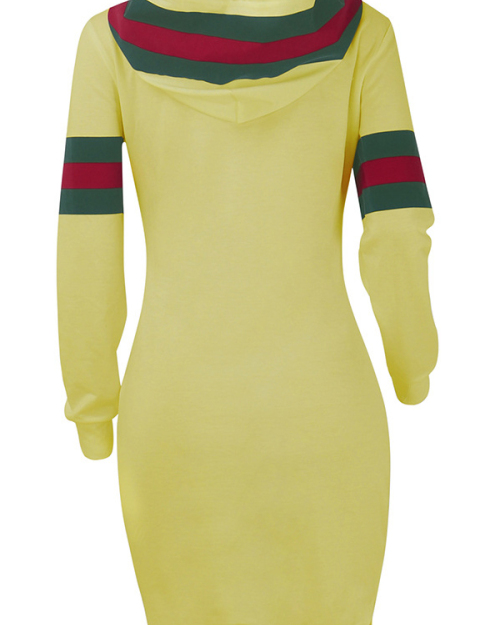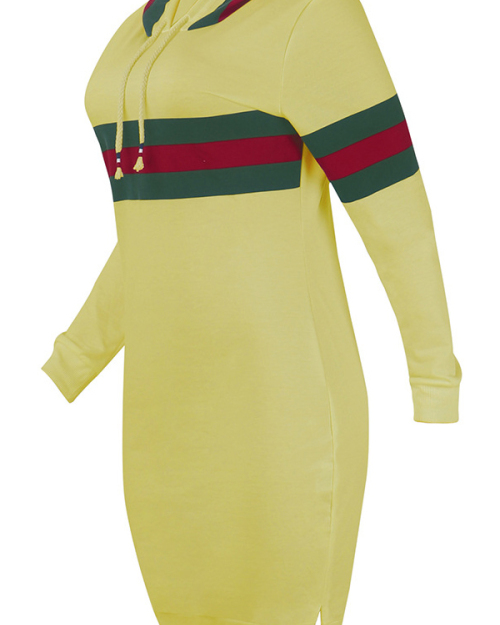 Leisure Hooded Collar Striped Patchwork Yellow Cotton Blend Knee Length Dress