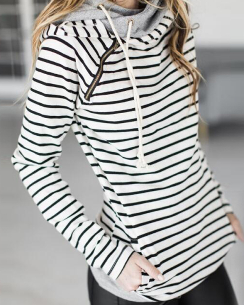 Leisure Long Sleeves Striped White Polyester Pullovers