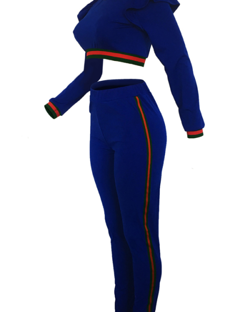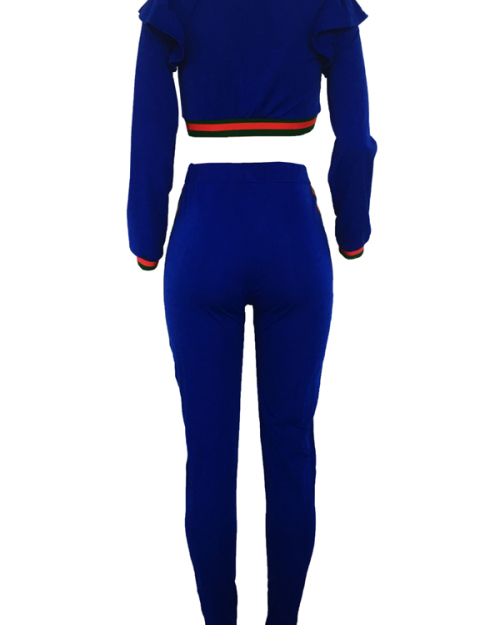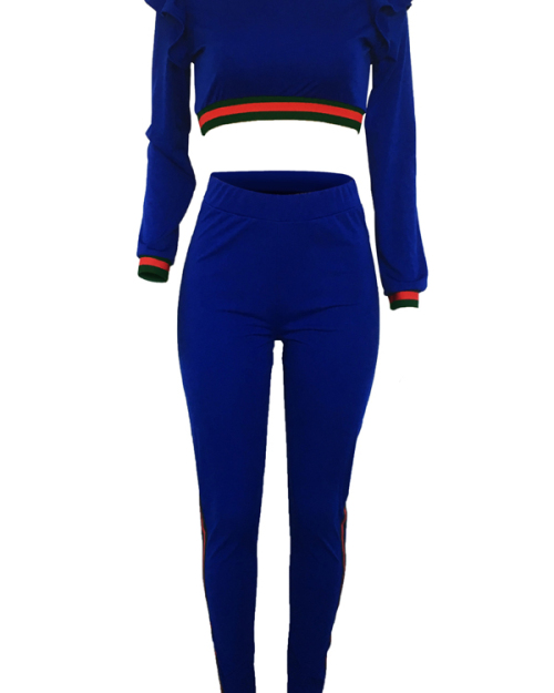Leisure Round Neck Falbala Design Blue Knitting Two-piece Pants Set