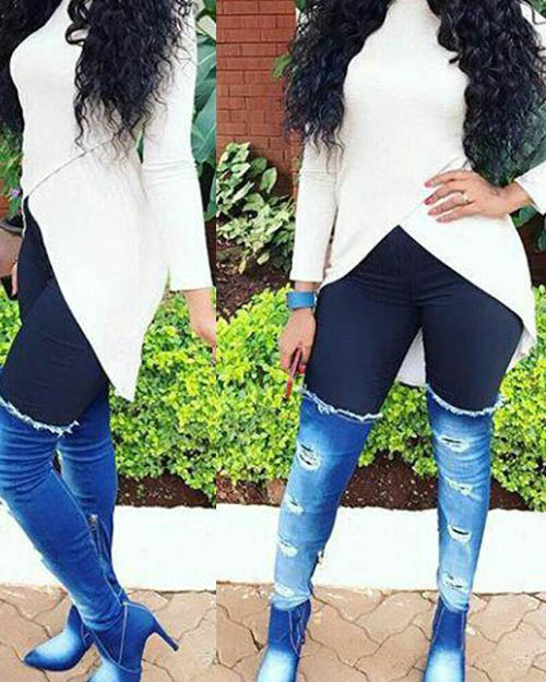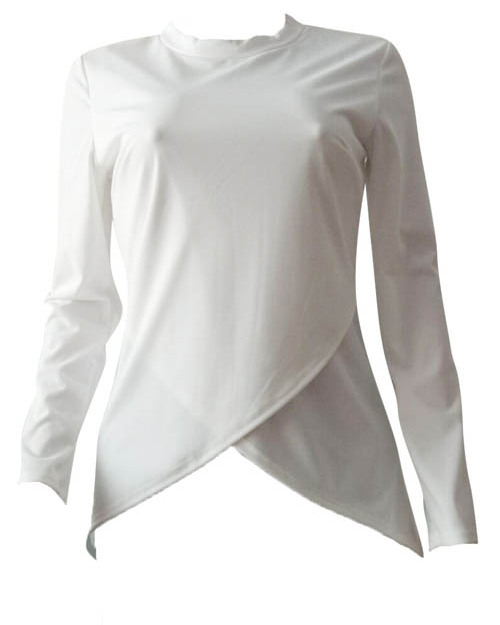 Leisure Round Neck Long Sleeves Asymmetrical White Polyester T-shirt