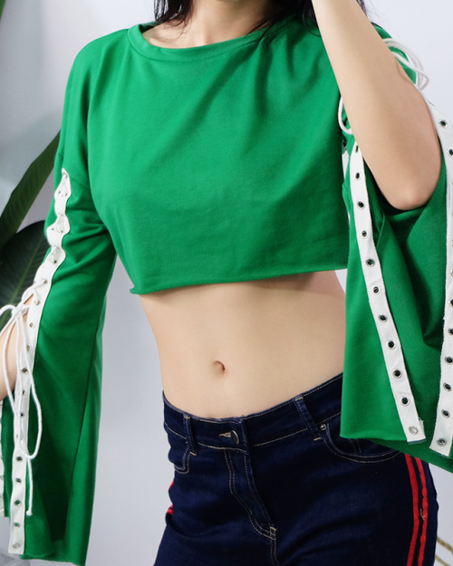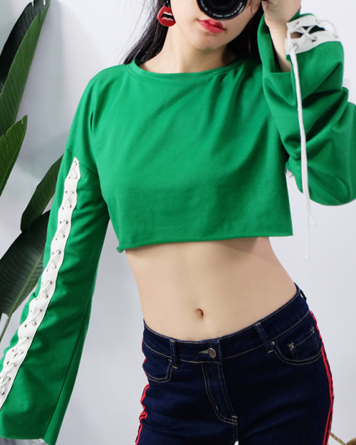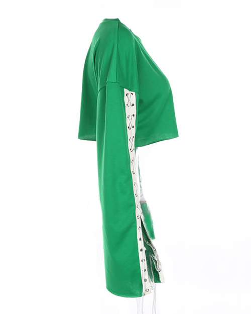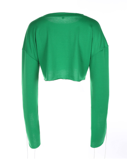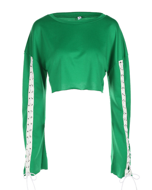 Leisure Round Neck Long Sleeves Lace-up Hollow-out Green Polyester Pullovers