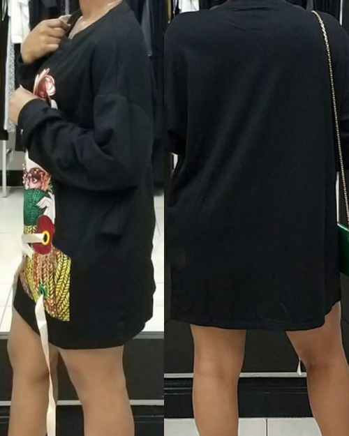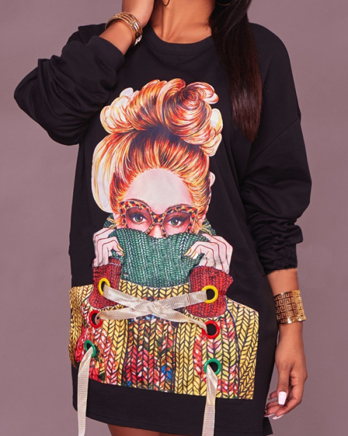 Leisure Round Neck Long Sleeves Printed Black Polyester Mini Dress