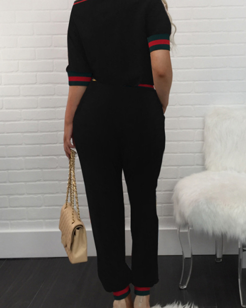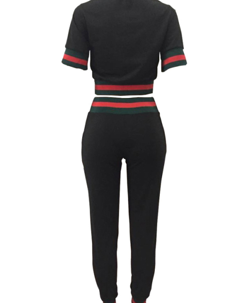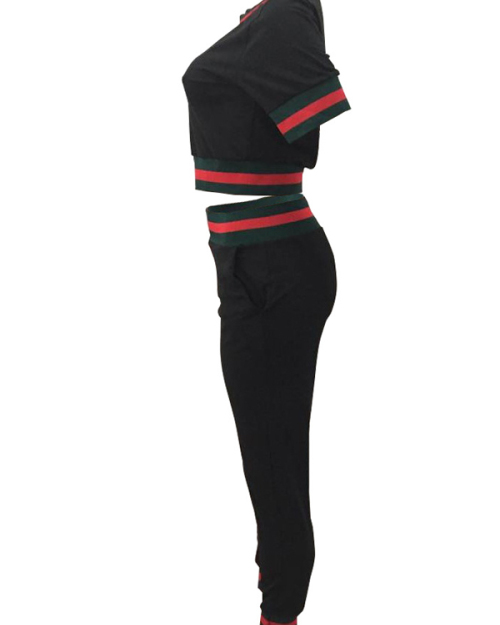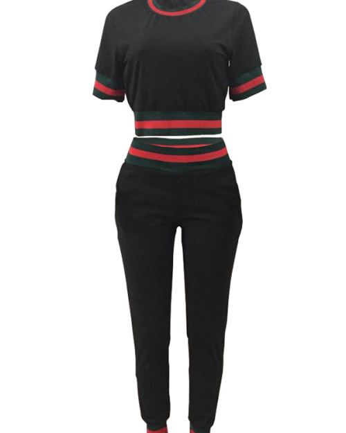 Leisure Round Neck Patchwork Black Knitting Two-piece Pants Set