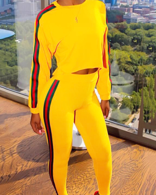 Leisure Round Neck Patchwork Yellow Blending Two-piece Pants Set