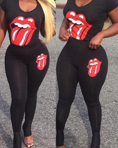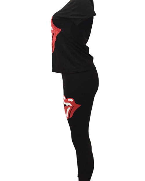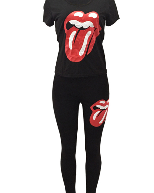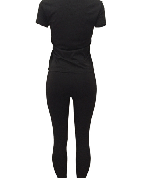 Leisure Round Neck Printed Black Knitting Two-piece Pants Set
