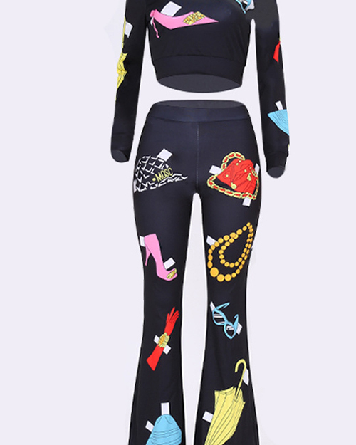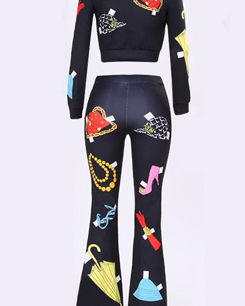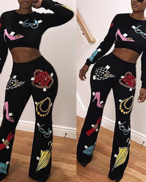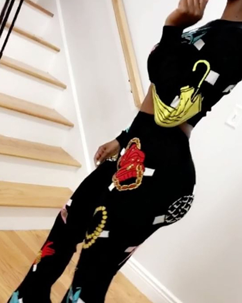 Leisure Round Neck Printed Black Polyester Two-piece Pants Set