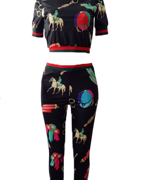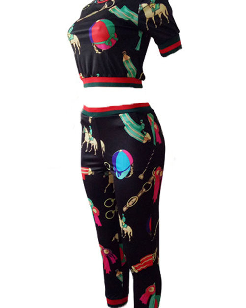 Leisure Round Neck Printed Black Polyester Two-piece Pants Set