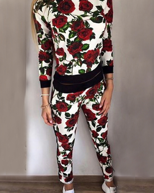 Leisure Round Neck Rose Printed White Nylon Two-piece Pants Set
