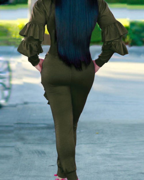Leisure Round Neck Ruffles Patchwork Army Green Polyester One-piece Jumpsuits