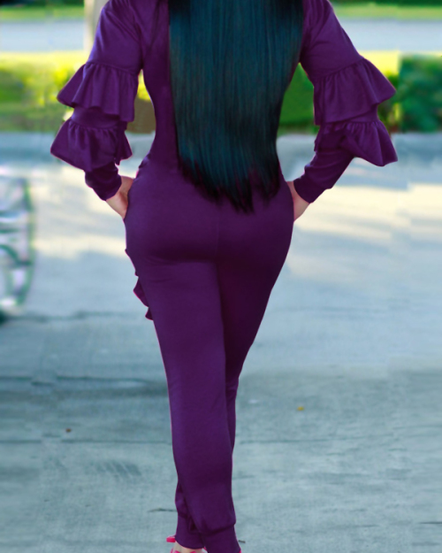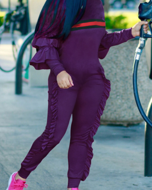 Leisure Round Neck Ruffles Patchwork Purple Polyester One-piece Jumpsuits