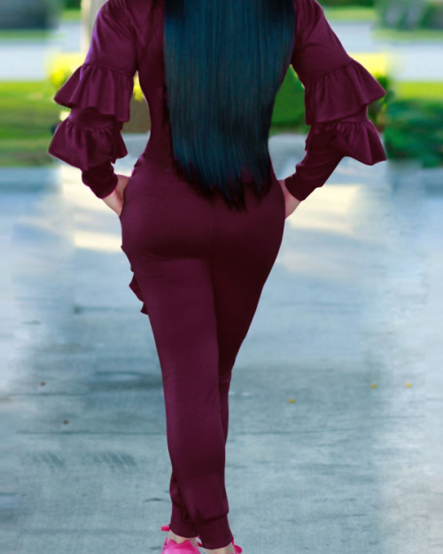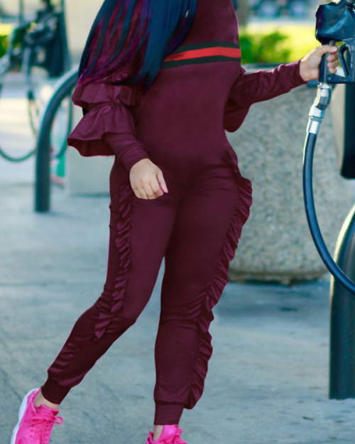 Leisure Round Neck Ruffles Patchwork Purplish Red Polyester One-piece Jumpsuits