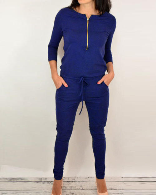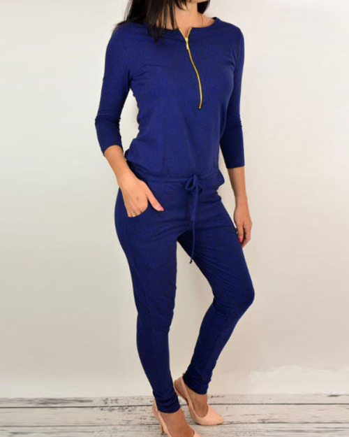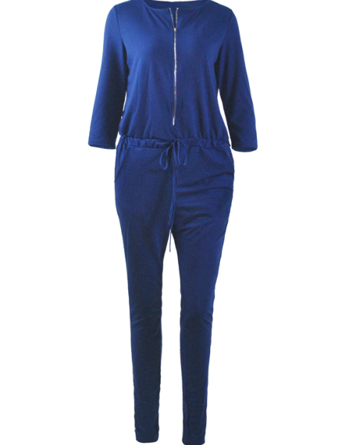 Leisure Round Neck Zipper Design Blue Cotton Blends One-piece Jumpsuits