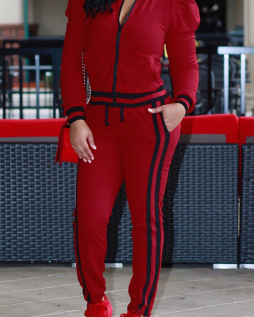 Leisure Round Neck Zipper Design Red Cotton Two-piece Pants Set