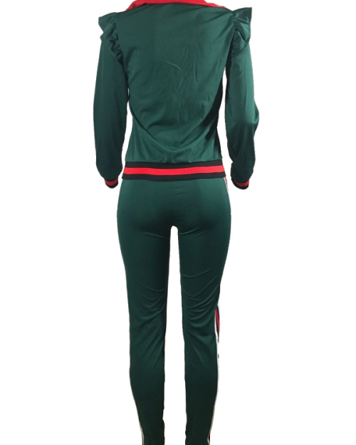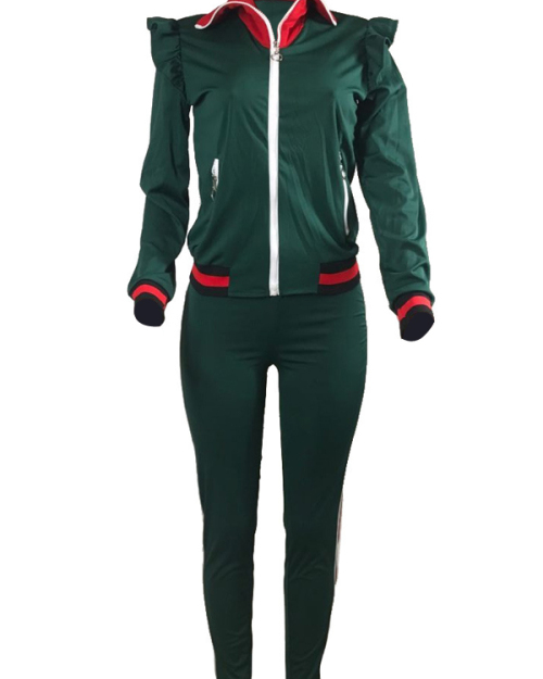 Leisure Turndown Collar Long Sleeves Zipper Design Green Cotton Two-piece Pants Set
