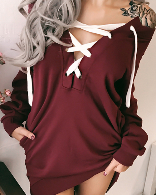 Leisure V Neck Lace-up Hollow-out Jujube-red Polyester Knee Length Dress