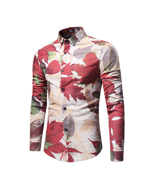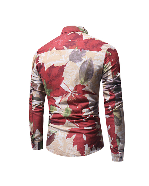 Fashion Turndown Collar Long Sleeves Leaf Printed Khaki Cotton Shirts(Non Positioning Printing)