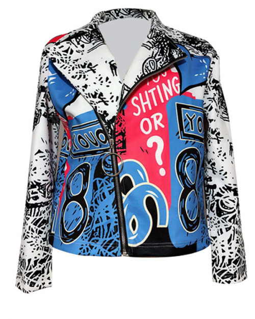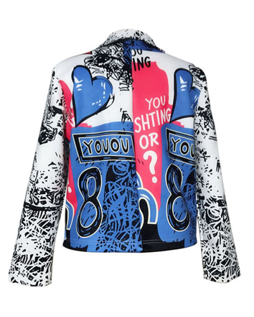Chic Turndown Collar Long Sleeves Printed Blue Polyester Zipped Coat