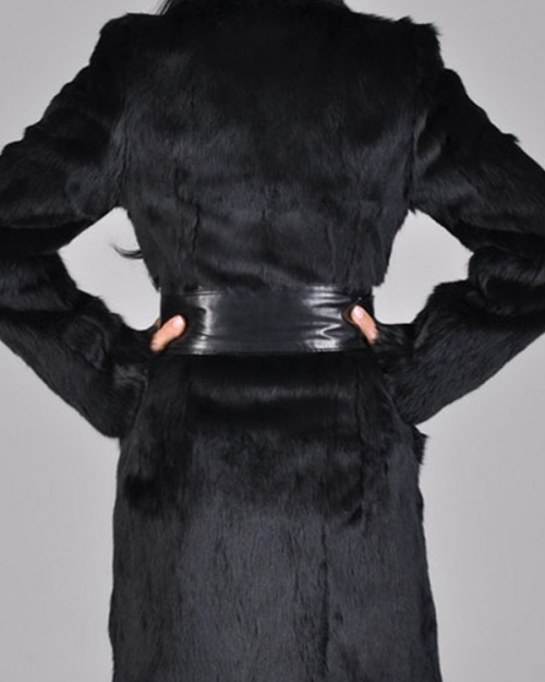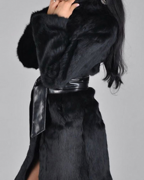 Stylish Turtleneck Long Sleeves Patchwork Black Faux Fur Coat(With Belt)
