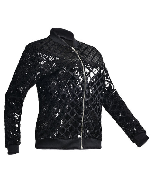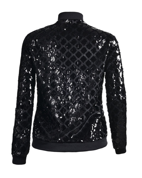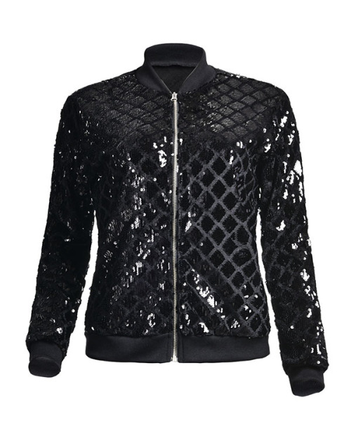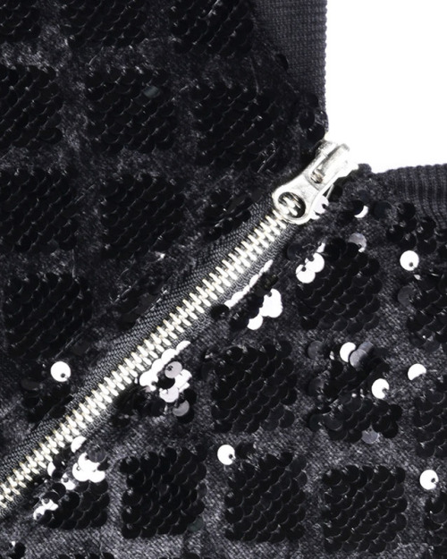 Trendy Mandarin Collar Sequins Decoration Black Polyester Zipped Jacket