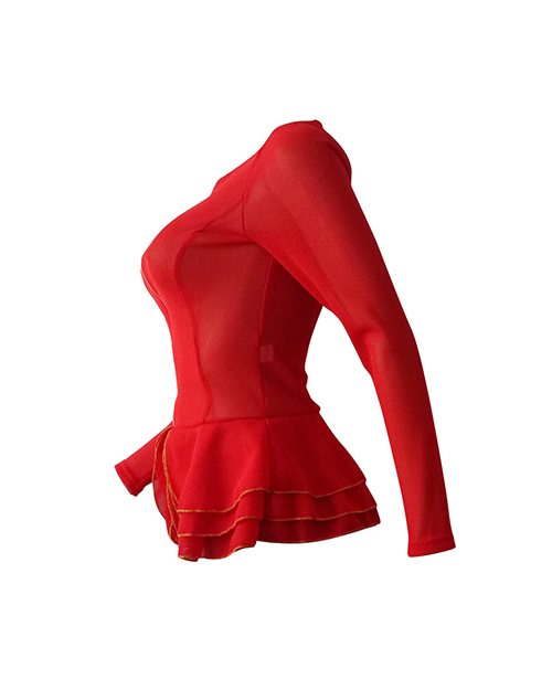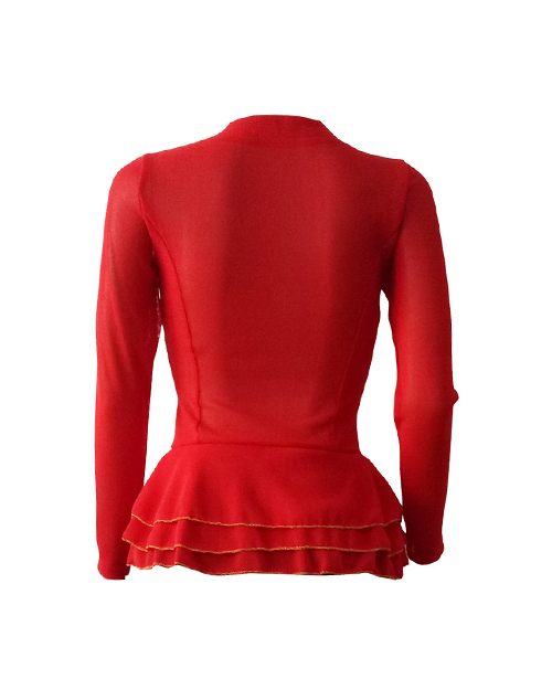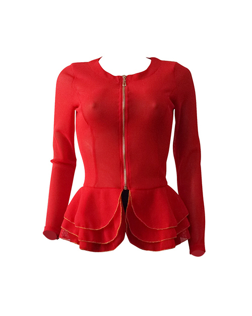 Trendy Round Neck Layered Lotus Leaf Edges See-Through Red Polyester Zipped Jacket(Without Belt)