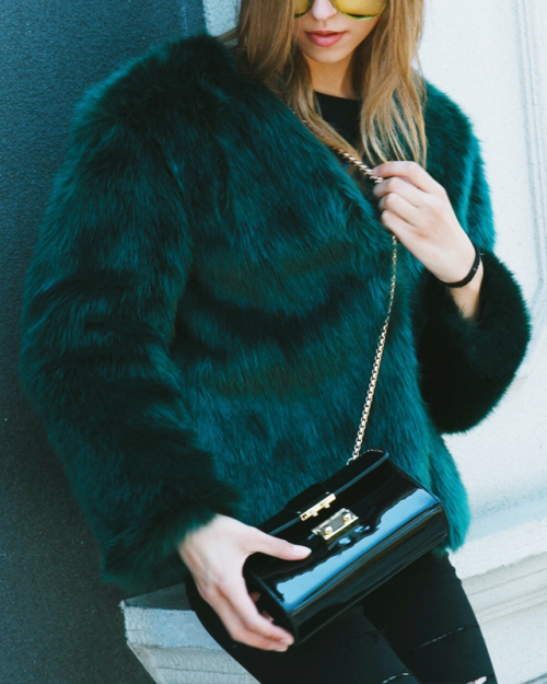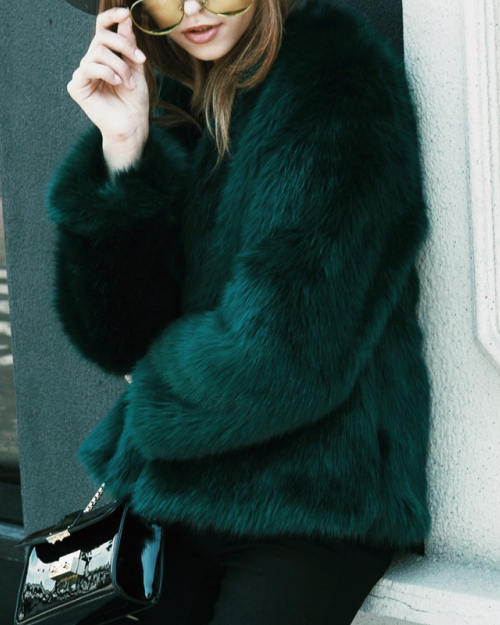 Trendy V Neck Long Sleeves Fur Design Black-green Short Coat