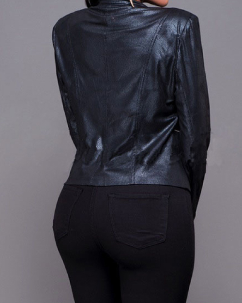 Trendy Turndown Collar Long Sleeves Zipper Design Black PU Jacket