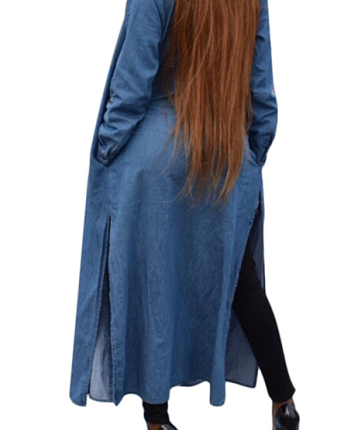 Leisure Turndown Collar Long Sleeves Side Split Blue Denim Long Coat Leisure Turndown Collar Long Sleeves Side Split Blue Denim Long Coat